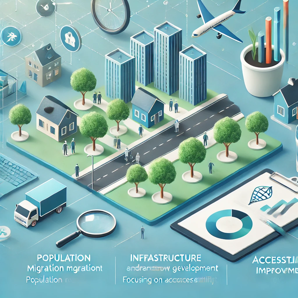 투자자들은 인구 이동 패턴과 인프라 개발 계획을 주의 깊게 살펴봅니다. 인구 이동 패턴은 지역의 주택 수요와 공급에 직접적인 영향을 미치며, 이는 투자 수익성에 직결됩니다. 동시에, 인프라 개발 계획은 장기적인 부동산 가치 상승을 기대할 수 있는 중요한 요소로 작용합니다. 새로운 도로나 철도 건설, 대중교통 확장은 지역의 접근성을 높여 부동산 가치 상승에 기여합니다.